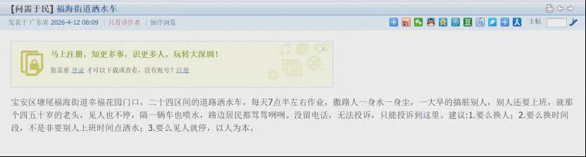 今年深圳凭借优美市容与满城花草频频登上热搜,城市形象持续提升,但与之形成反差的是,洒水车扰民问题仍屡遭市民投诉,成为城市治理中的一处明显短板。