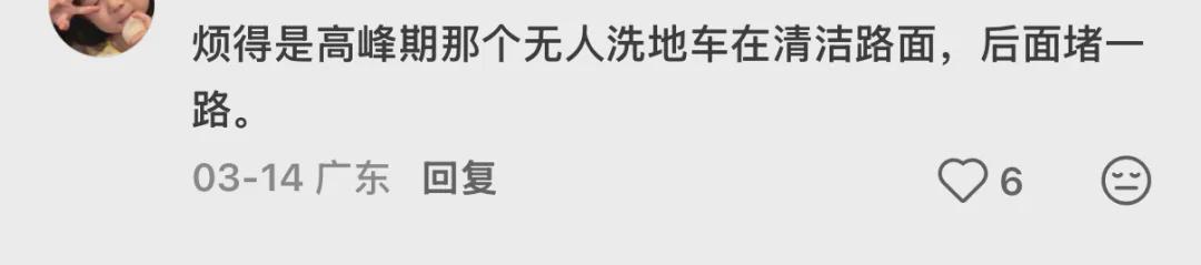 “高峰期无人洗地车在清洁路面,后面堵一路”“一公里路有3辆洒水车,2辆洒路面,1辆洒天上”。不少网友表示,城区主干道常有无人洗地车占道作业,行驶速度缓慢,直接压缩通行空间,导致后方车辆排长队拥堵,加剧高峰时段交通压力,影响通勤效率。