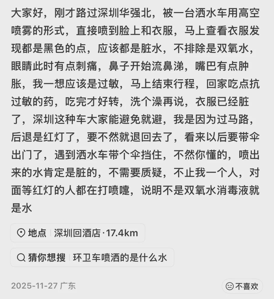 有市民在社交平台讲述了在华强北商圈的遭遇,途经此处遇到高空喷雾的洒水车作业,水雾直接喷洒在面部与衣物上。该市民发现,衣服表面附着大量黑色杂质斑点,皮肤后续出现发痒、泛红等轻微过敏症状。