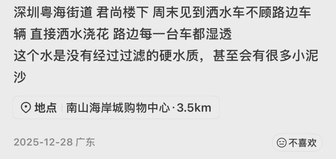 社交平台上,有市民时常被高空洒落的水雾淋湿衣物,“南山朝天洒水车,每次路过都被喷一身”。