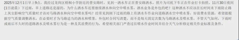 洒水车在雨后作业浪费资源,也遭到市民质疑。有网友通过深圳论坛反映,2025年12月1日,龙岗区梧桐小学附近普安路路段,洒水车在该片区降雨后仍开展洒水及空中喷雾作业。据观察,类似“雨后洒水”现象并非个例,并表示多次遇到降雨后路面未干时,洒水车仍按固定频次作业的情况,既浪费水资源,也造成公共资金的无效支出。