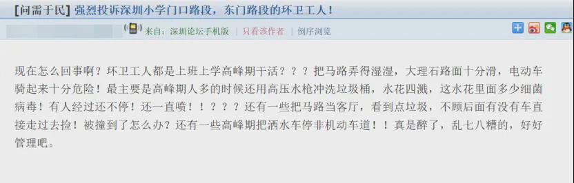 有深圳论坛网友反映,宝安区福海街道幸福花园门口二十四区间的洒水车,每天7点半左右作业,作业人员“见人也不停”“洒路人一身水一身尘”。深圳小学门口路段上班、上学高峰期也成了洒水车的工作时段,“有人经过还不停,一直喷”,电动车骑行在洒过水后的湿滑路面十分危险。
