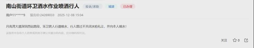 2025年11月,有市民通过人民网“领导留言板”反映,南山区粤海街道附近“经常在上班高峰期搞清洁,高压水枪清洁路边,路过时经常被喷一脸水”。