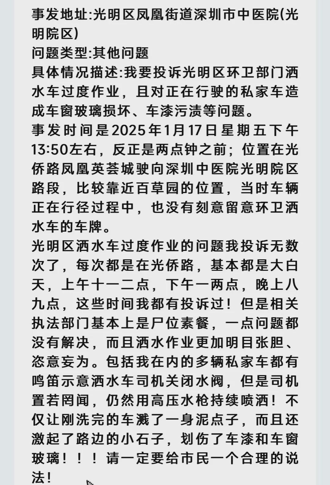 同年12月,有市民反映“月亮湾大道深圳西站路段,“环卫跨人行道喷水,行人路过不关闭水枪礼让,并向本人喷水”。