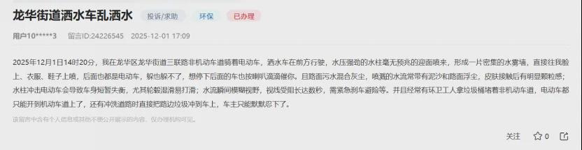 公共道路上,行人被强行喷洒的情况屡见不鲜。有市民通过人民网“领导留言板”反映,2025年12月1日,其骑电动车在龙华街道三联路行驶时,洒水车高压水柱直接往脸上、衣服、鞋子上喷,水柱冲击电动车导致车轮易打滑,视线受阻,极大威胁骑行安全。